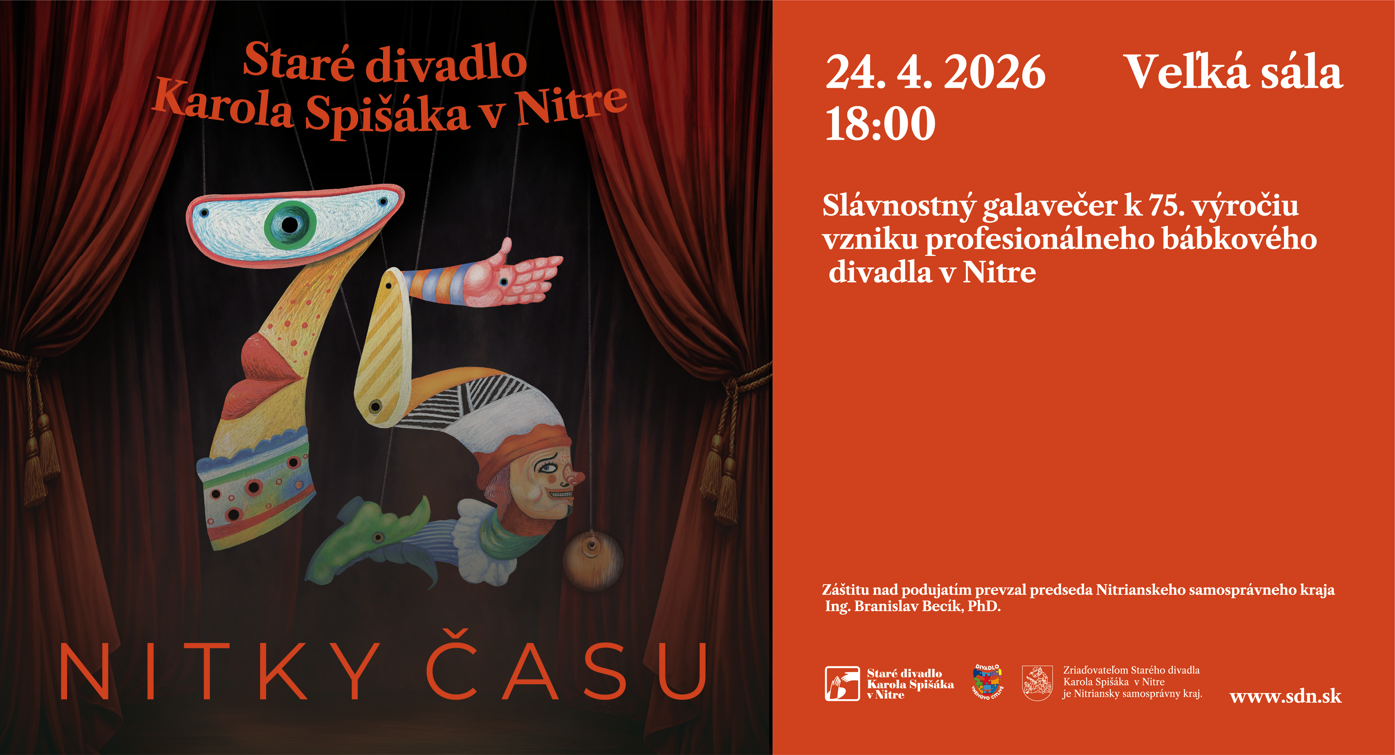 Oslava vzniku profesionálneho bábkového divadelníctva v Nitre je inscenovaná ako príbeh narodenia, života a budúcnosti Starého divadla. To je zobrazené ako živá bytosť - má svoju kolísku, prežíva detstvo, dospievanie a krízy, má svoje túžby i sny o budúcnosti. Celým večerom nás sprevádzajú tri postavy – Minulosť (Ivan Gontko), Prítomnosť (Vanesa Balla Hagyungová) a Budúcnosť – v podobe modernej bábky (Danica Hudáková, Simon Fico, Juraj Bednarič). Títo hrdinovia vyvolávajú spomienky na históriu divadla pre deti, komentujú jeho zlomové udalosti, oživujú jeho veselé i ťažšie chvíle. V galaprograme budú prezentované krátke ukážky archívnych záznamov z inscenácií a histórie divadla i video spomienky bývalých hercov a zamestnancov súboru. Ukážky z úspešných predstavení budú predstavené aj v novom naštudovaní hercov Starého divadla – na javisku ožijú klasické bábkové tituly ako Veselé medvieďatá, Zakliati bratia, Malá morská panna či Faust. Slávnostný hudobno-dramatický program Nitky času je určený širokej rodine priaznivcov bábkového divadla a poteší nielen pamätníkov, ale i mladé publikum. Réžie slávnostného večera sa ujal Peter Oravec.